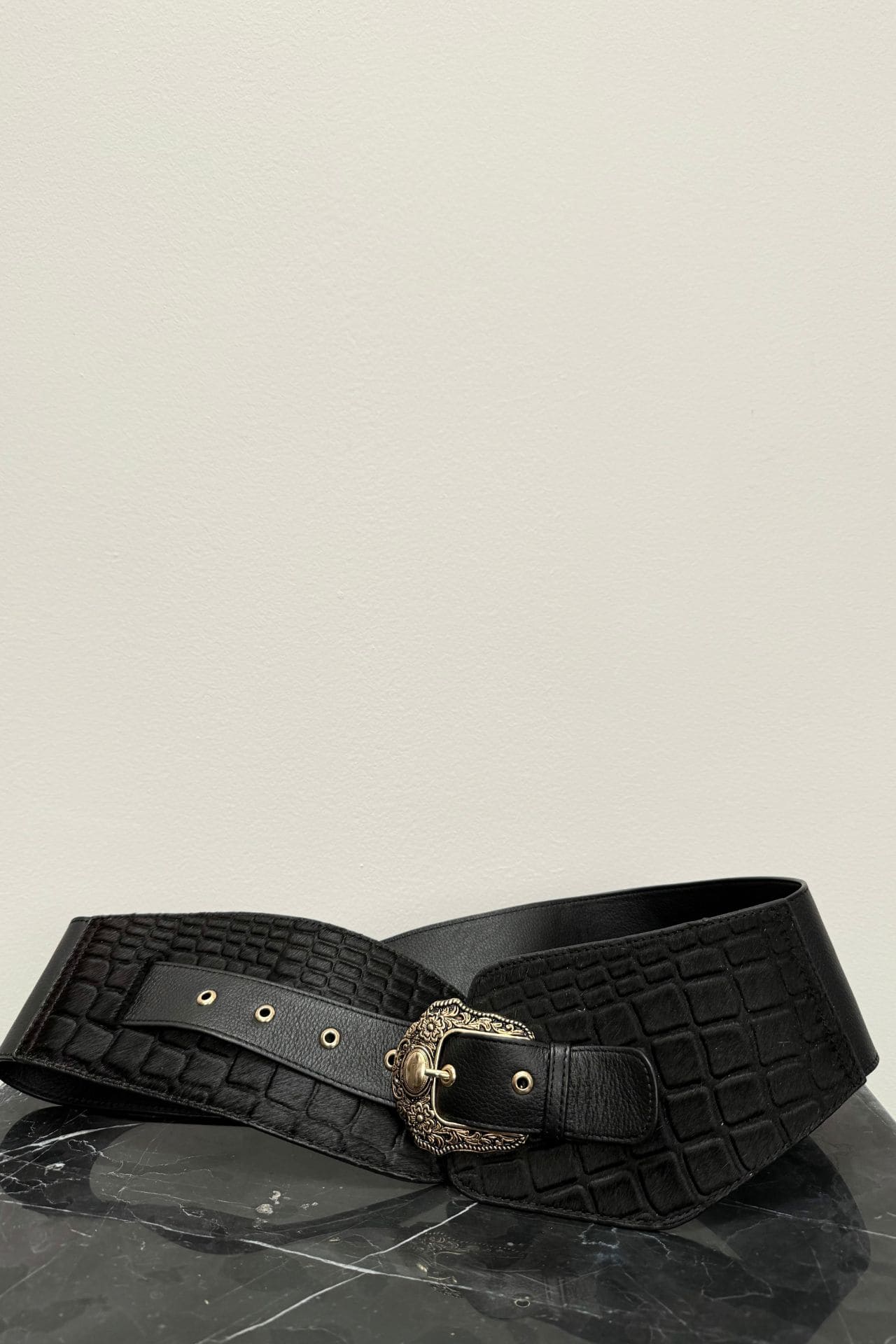 Cinturón de pelo de vaca color negro con textura de cocodrilo grabada. Su diseño versátil permite usarlo a la cintura o a la cadera, adaptándose a distintos estilos. Inspirado en la tendencia boho y western, eleva cualquier outfit.