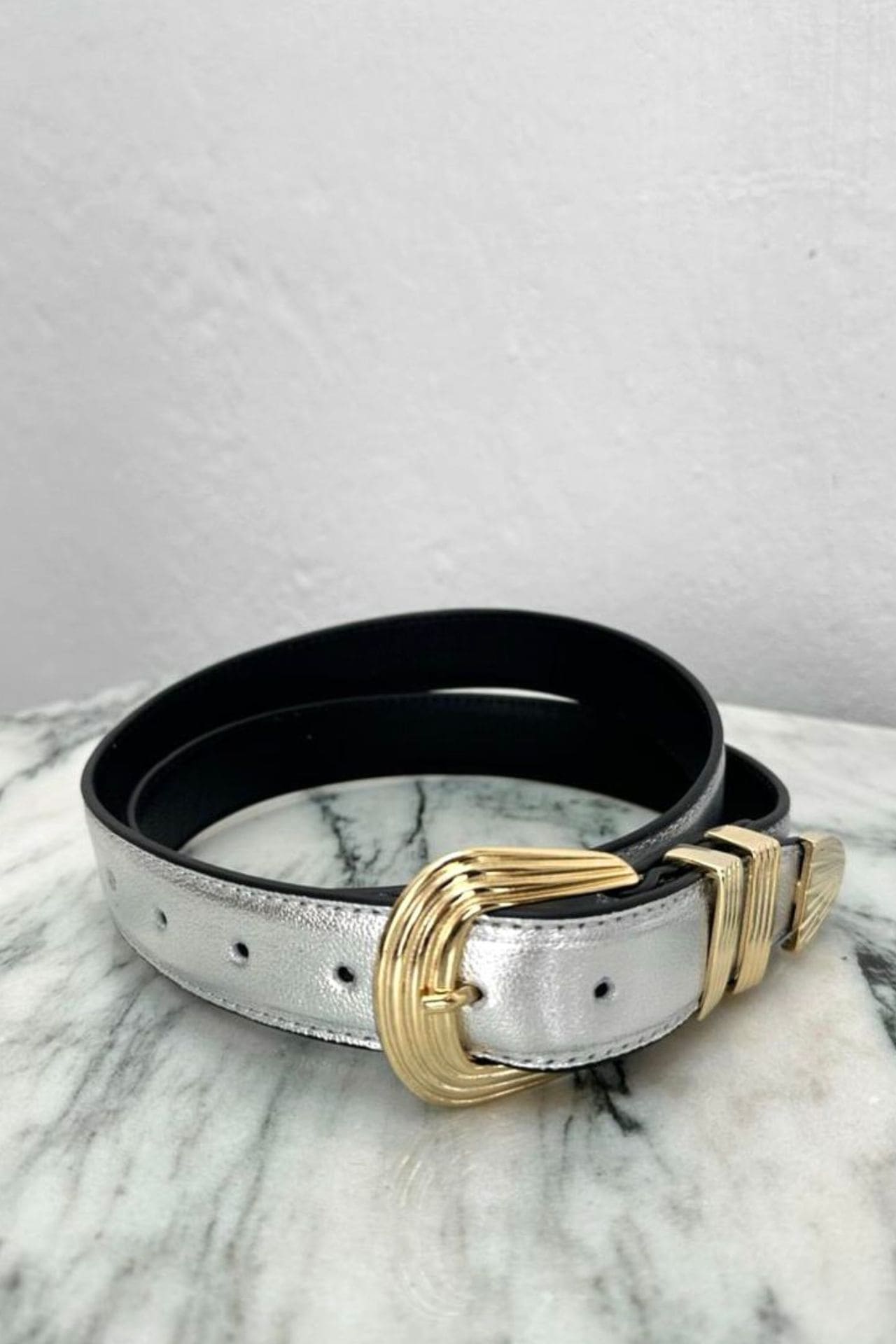 Cinturón de piel color plata. Con hebilla dorada que combina el estilo western con elegancia. Es un accesorio que elevará todos tus outfits, úsalo a la cintura o a la cadera, perfecto para tus jeans.