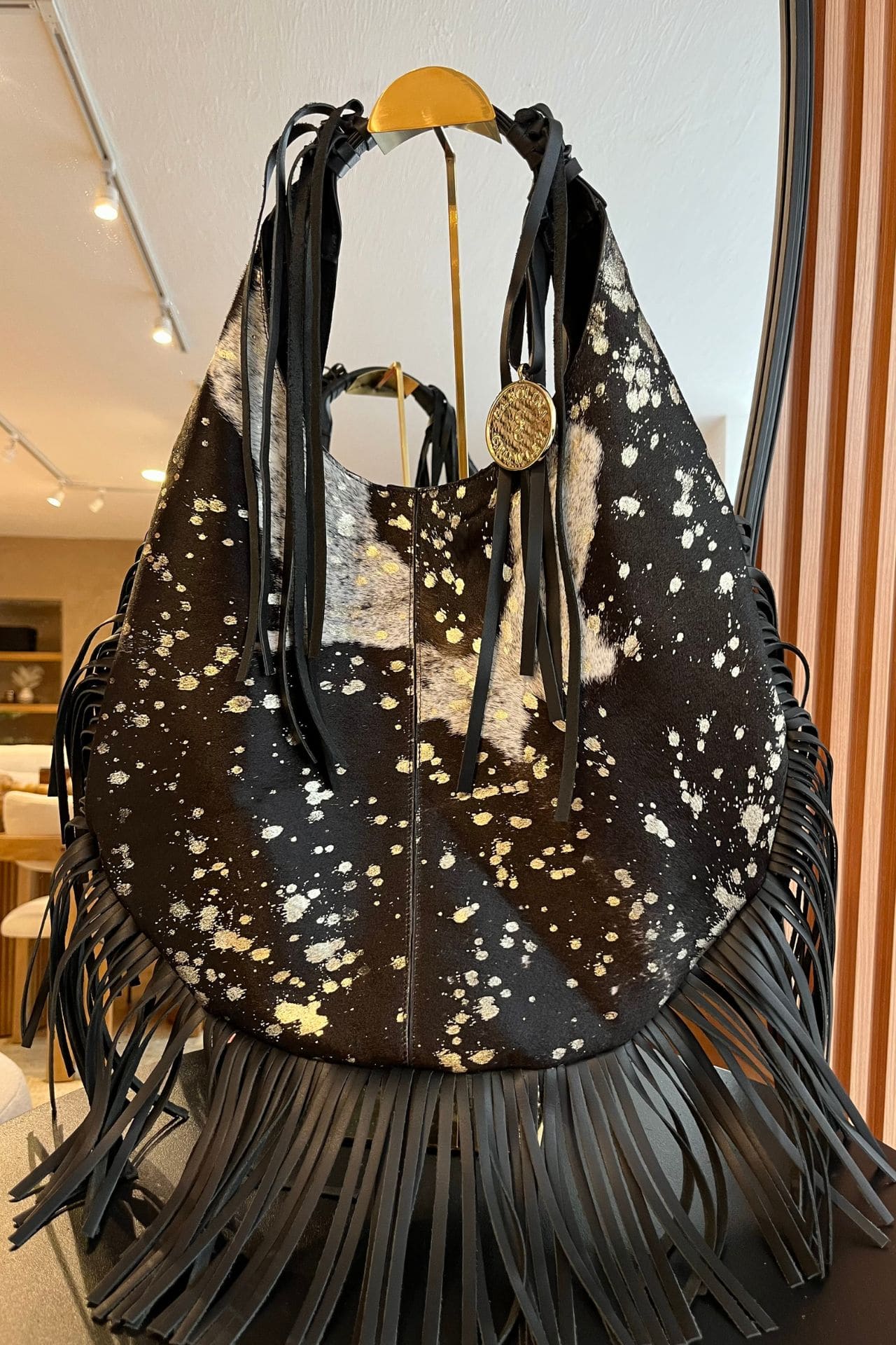 Bolso hobo de pelo de vaca pintado a mano con plateado. Cada pieza es única.
