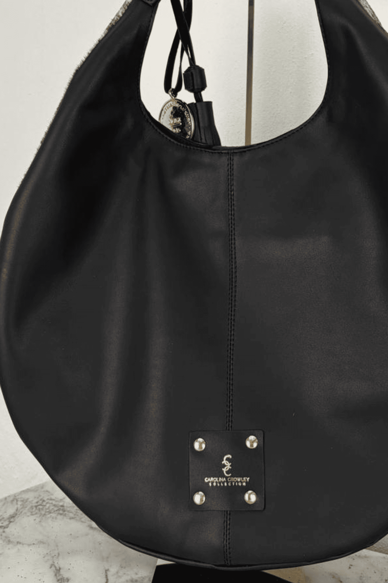 Bolso hobo de pelo de vaca. Cada pieza es única. Ligero, práctico y con un diseño que fusiona el estilo western con la elegancia. Con un pompón de piel, Interior forrado en gamuza, tres bolsillos y cierre de botón.