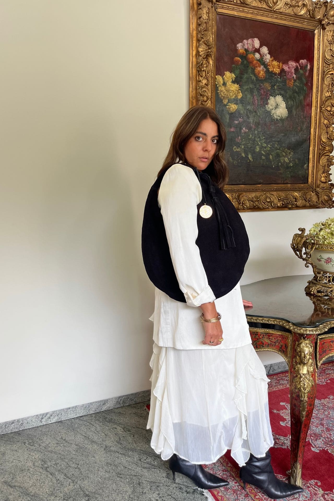 Bolso hobo de gamuza color negro. Con un diseño boho chic, es un bolso cómodo, practico y muy versátil, ideal para diversas ocasiones. Amplio, con tres bolsillos internos y cierre de botón.
