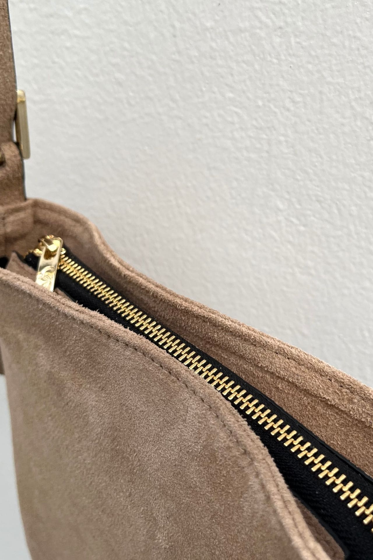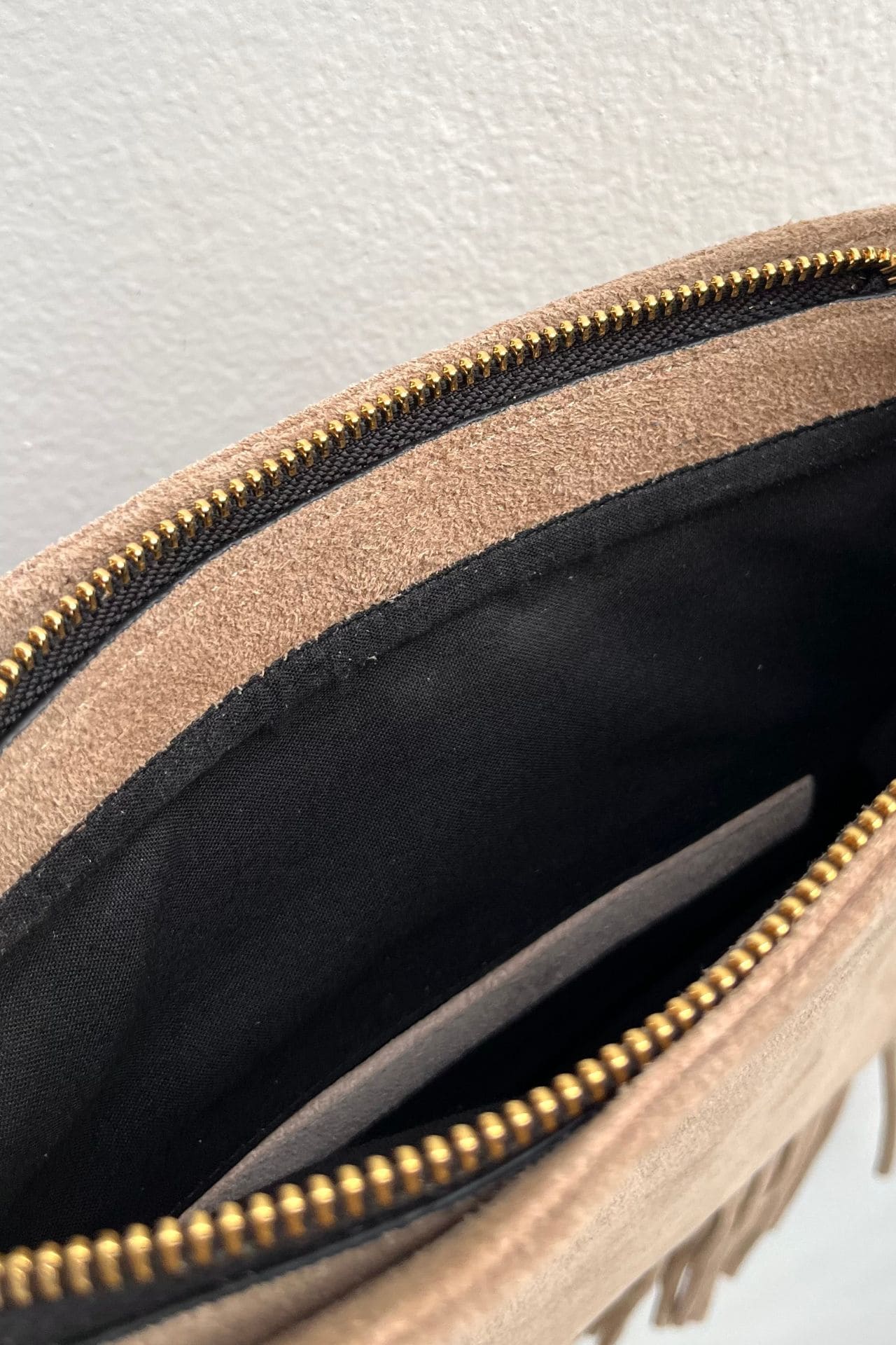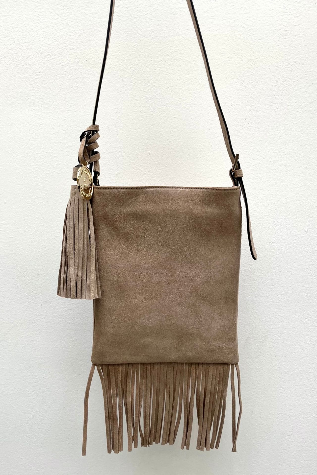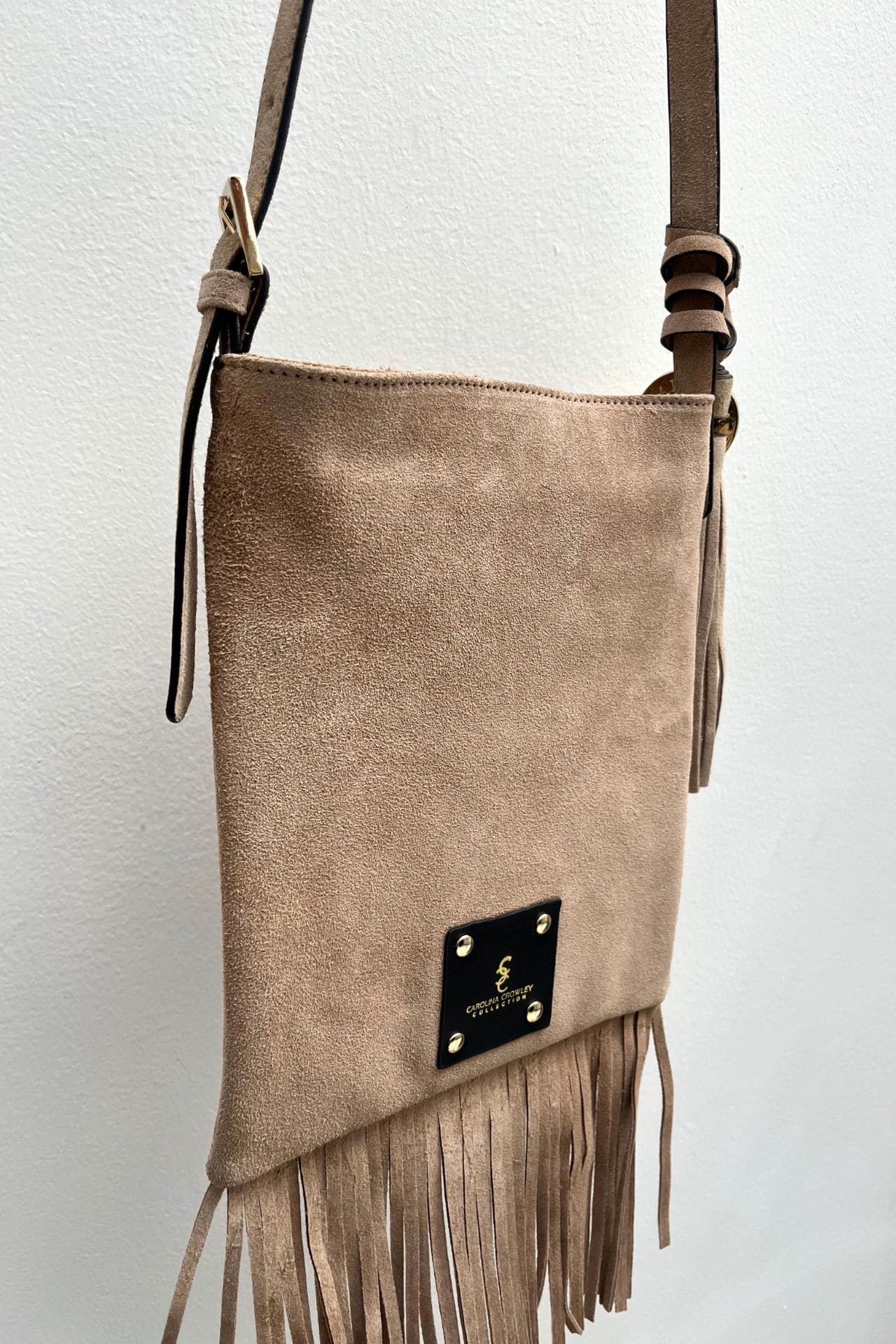Bolso crossbody de gamuza color arena. Sus barbas le dan un toque boho y trendy. Será un bolso cómodo y ligero para llevar a todos lados y destacar.