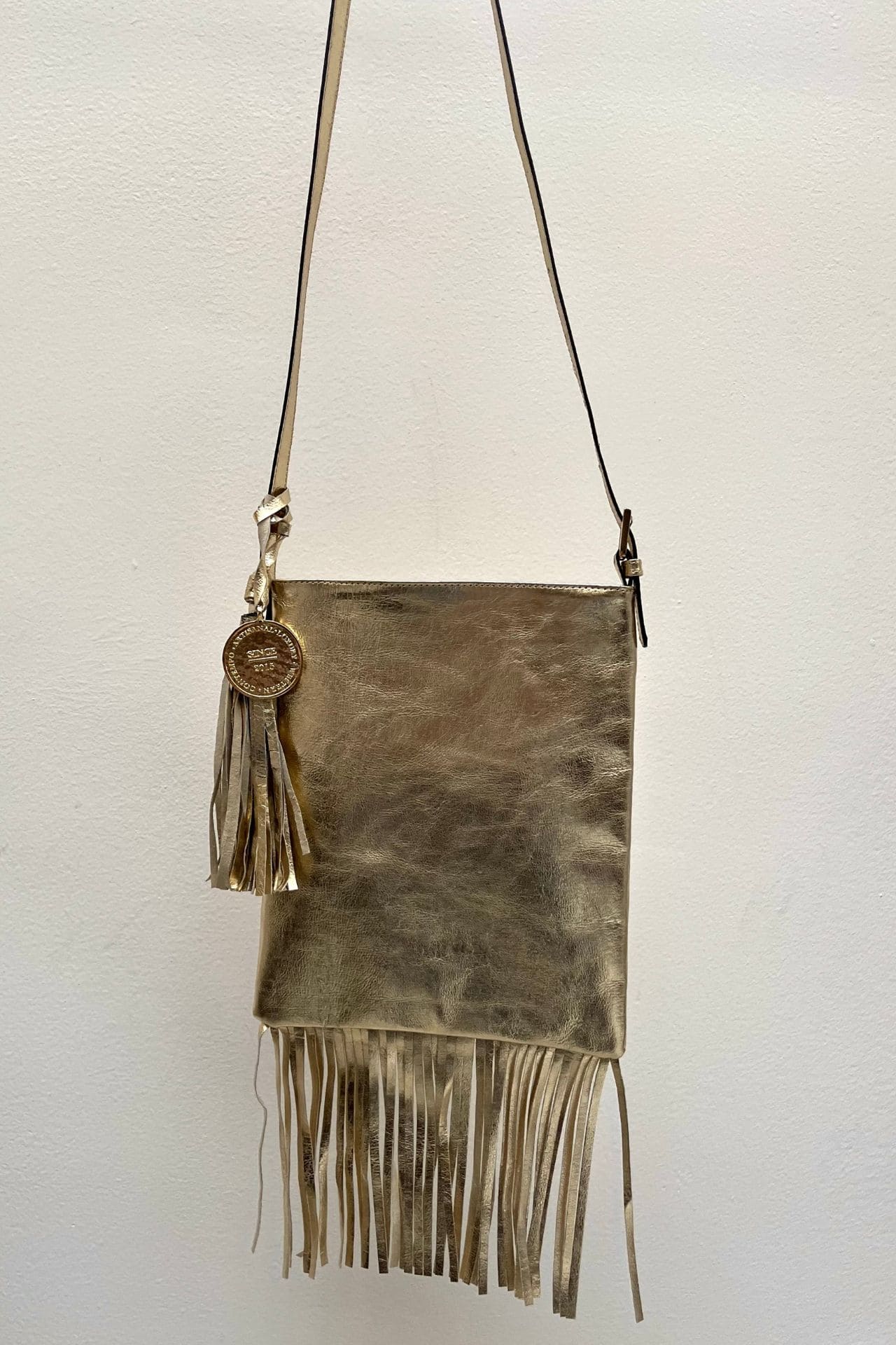 Bolso crossbody de piel texturizada color oro. Sus barbas le dan un toque boho y trendy. Será un bolso cómodo y ligero para llevar a todos lados y destacar.
