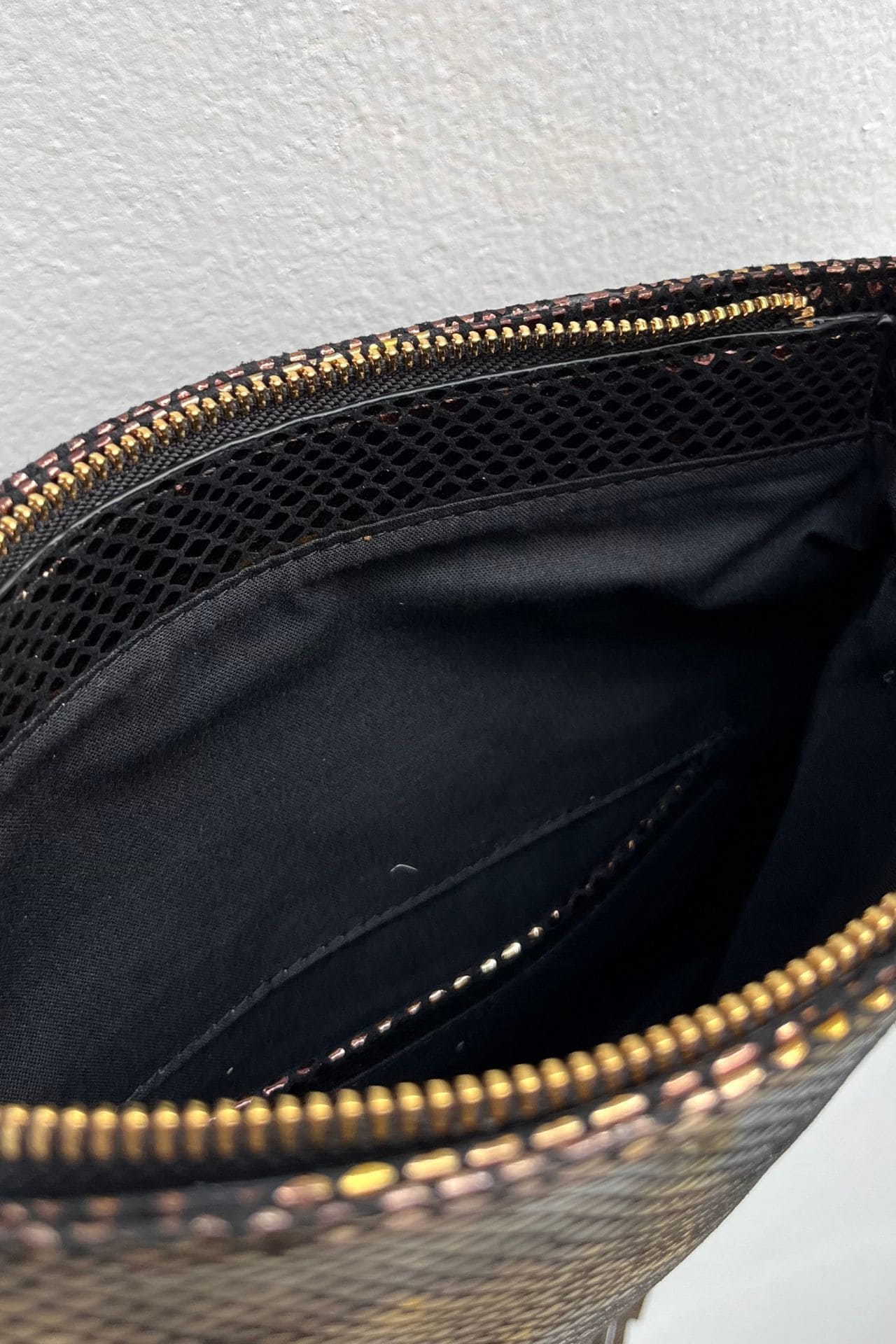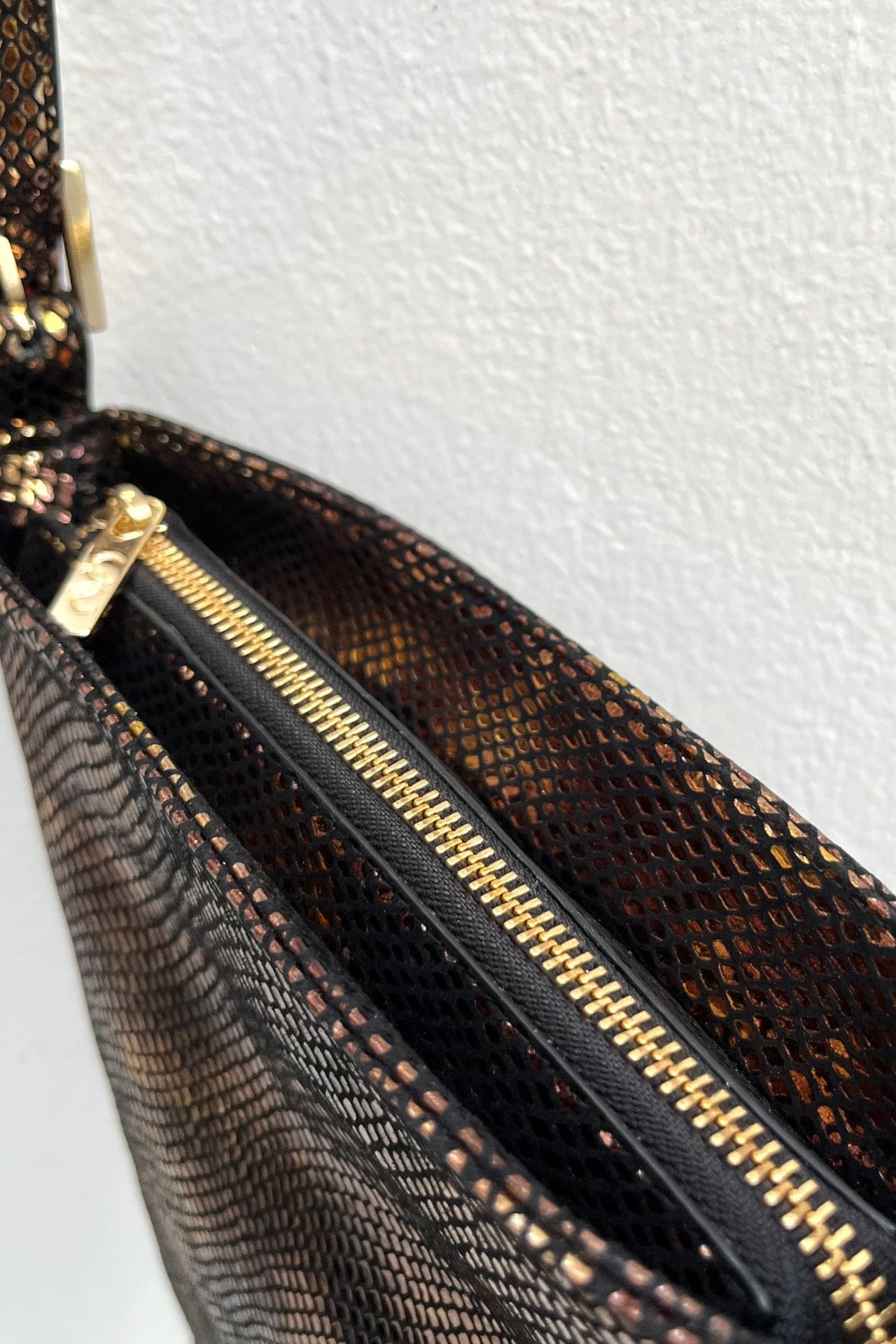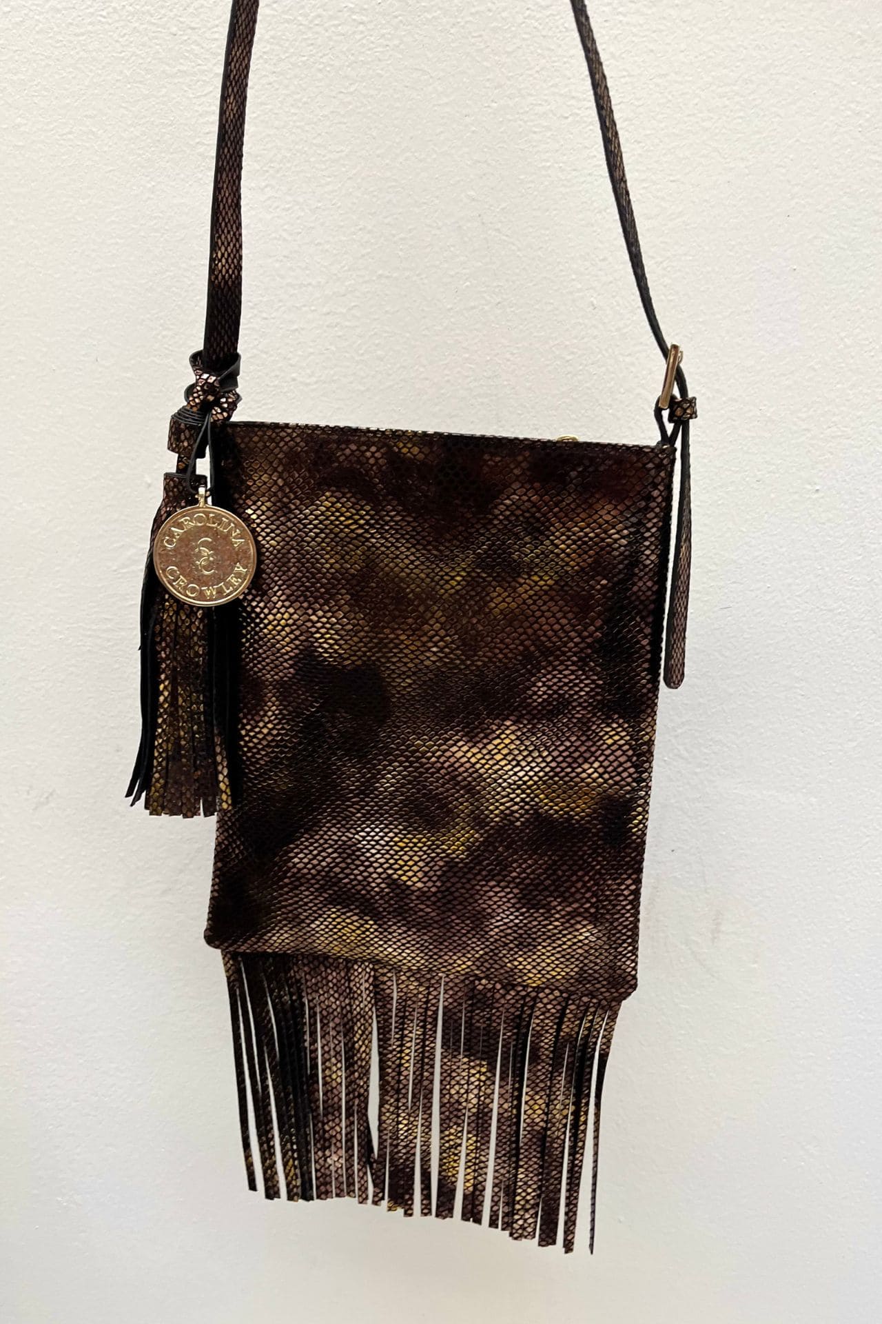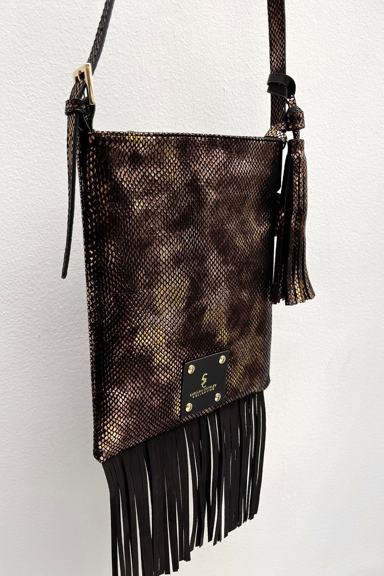 Bolso crossbody de piel texturizada con print snake tornasol. Sus barbas le dan un toque boho y trendy. Será un bolso cómodo y ligero para llevar a todos lados y destacar.