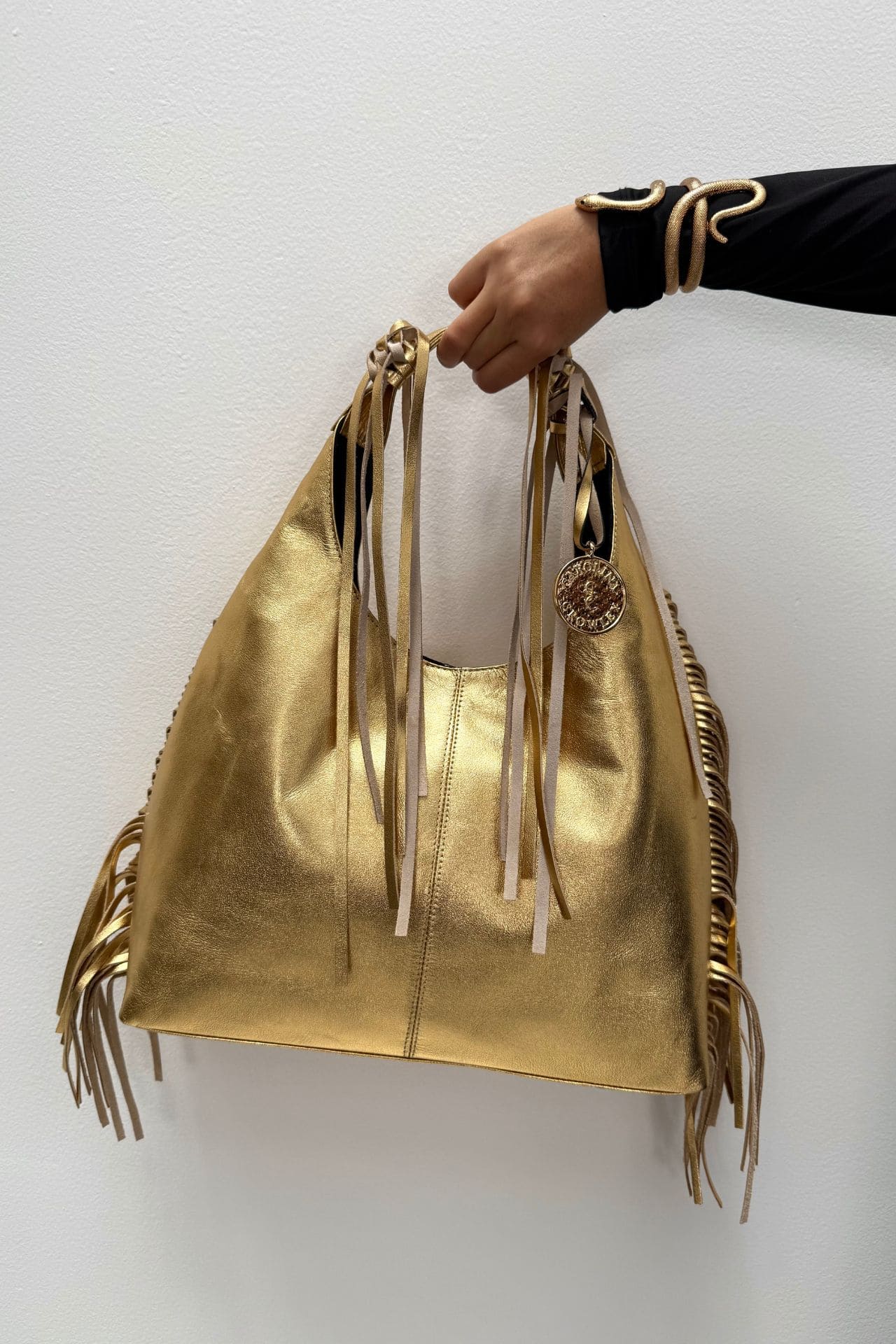 Bolso de piel en color oro Es la versión de nuestro clásico hobo bag en tamaño mediano para quienes quieren la comodidad, espacio y estilo en un un bolso mas corto.