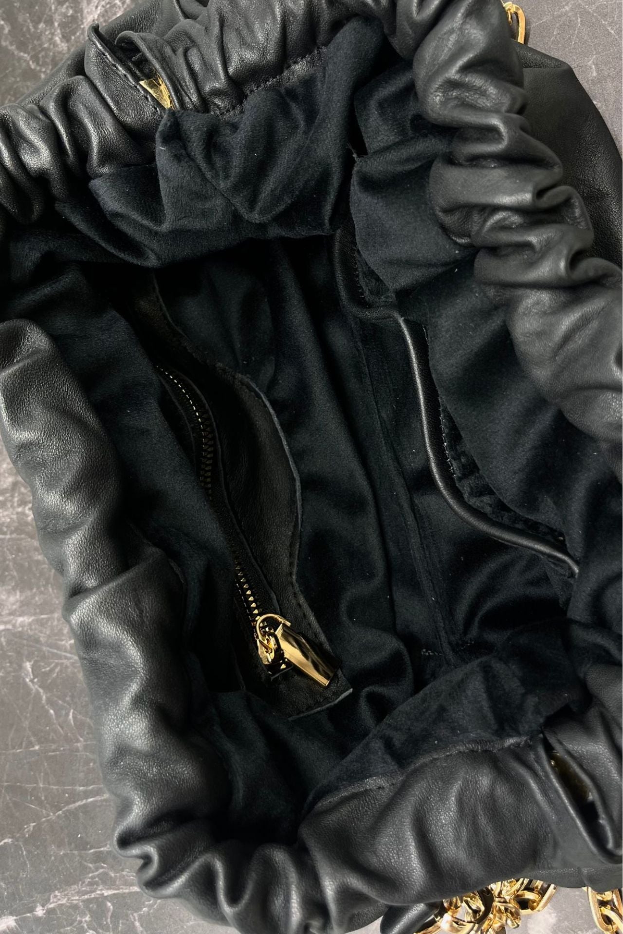 Bolso de piel color negro. Es versátil y elegante, ideal como clutch o como crossbody con su cadena dorada. Con forro de terciopelo y compartimentos interiores para mayor funcionalidad.