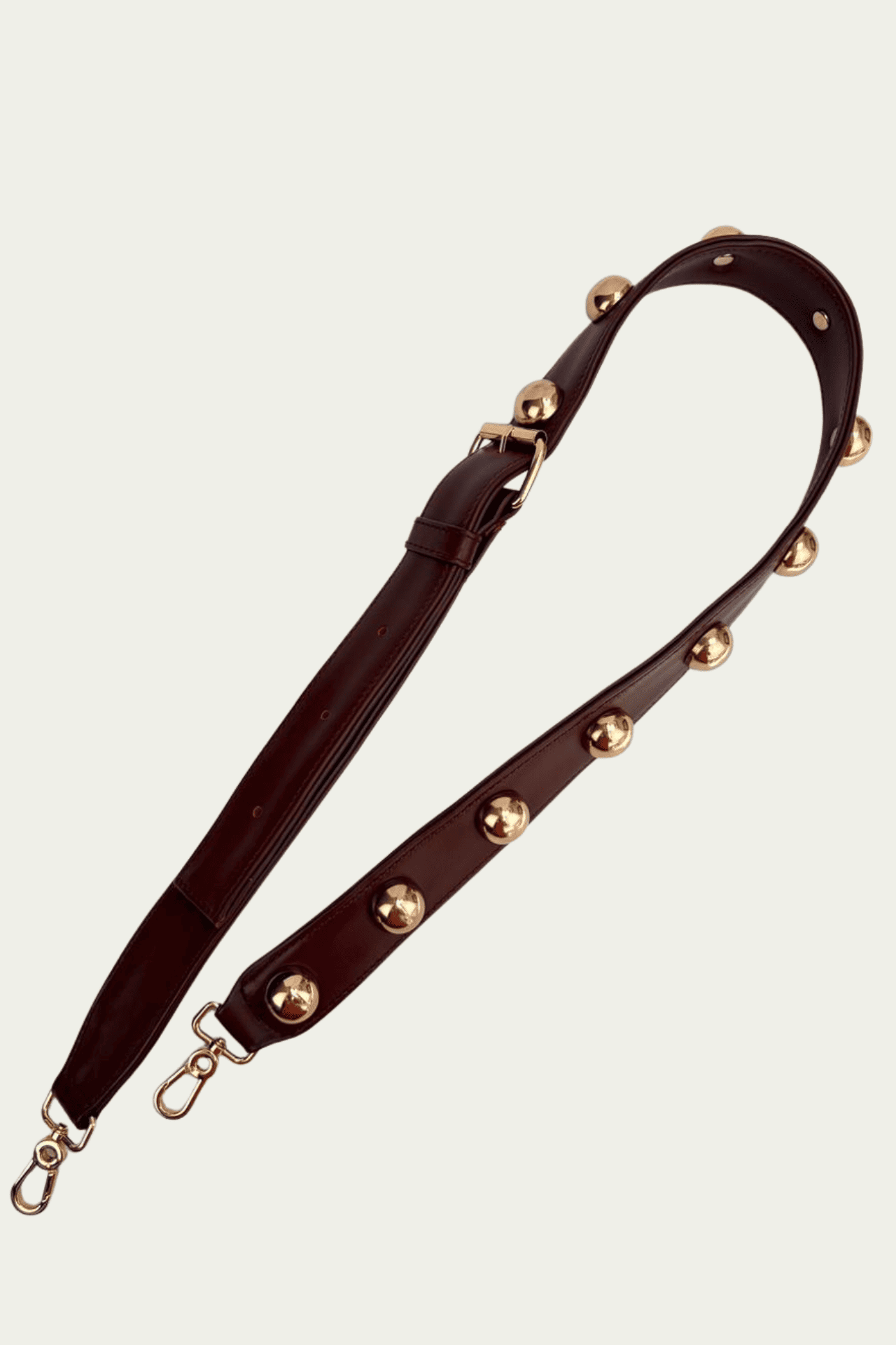 Strap de piel color vino y estoperoles dorados que resaltan más a este accesorio. Úsalo con tus bolsos favoritos, le dará un toque extra de estilo, originalidad y versatilidad.