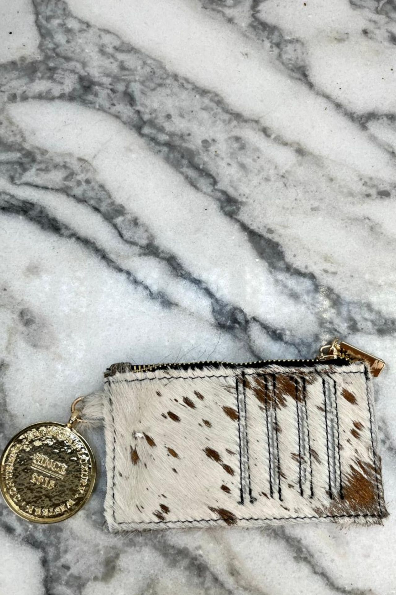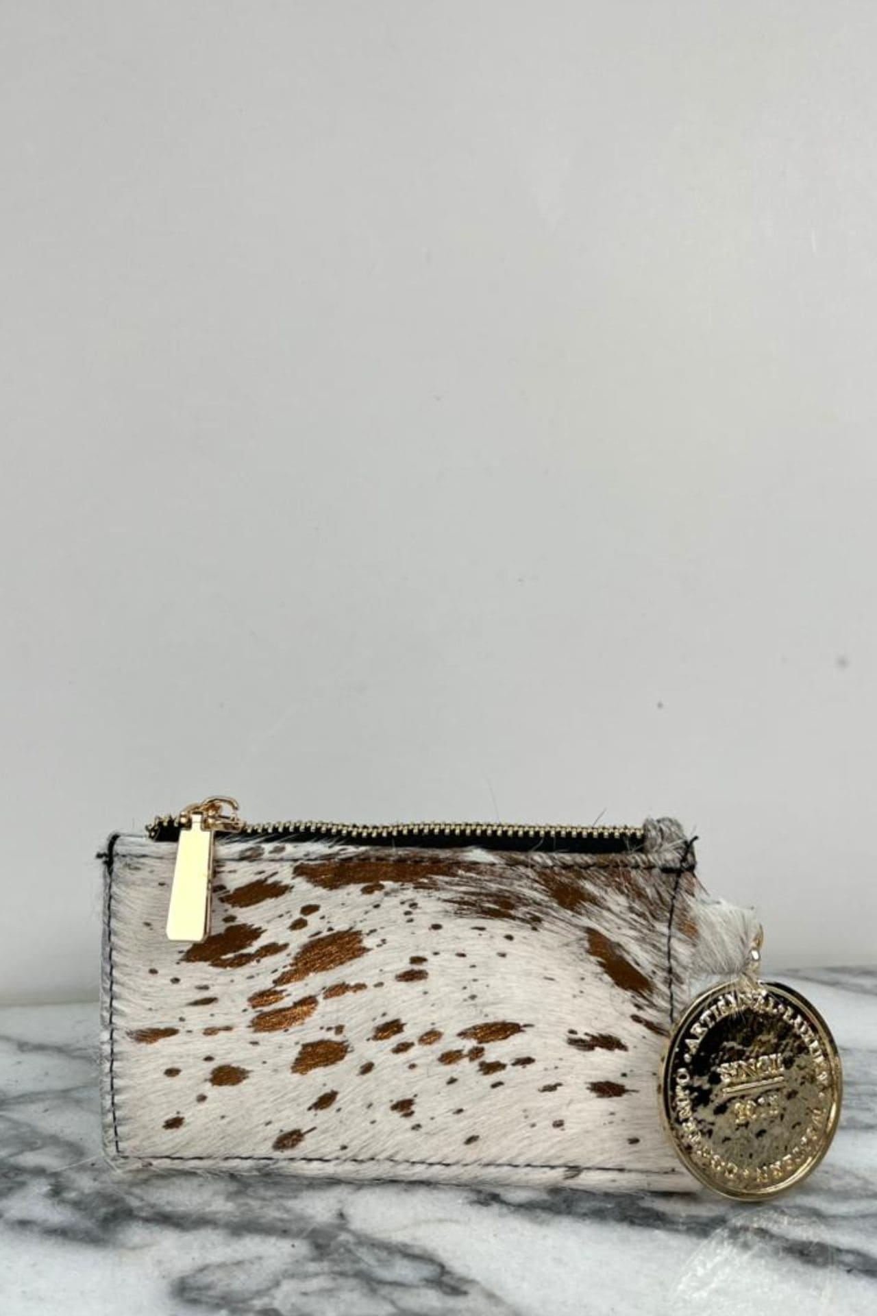 Tarjetero de pelo de vaca pintado a mano con color cobre, cuenta con 4 compartimentos para tarjetas y un bolsillo con cierre para usarlo como monedero . Es un accesorio muy práctico que podrás llevar en todos tus bolsos.