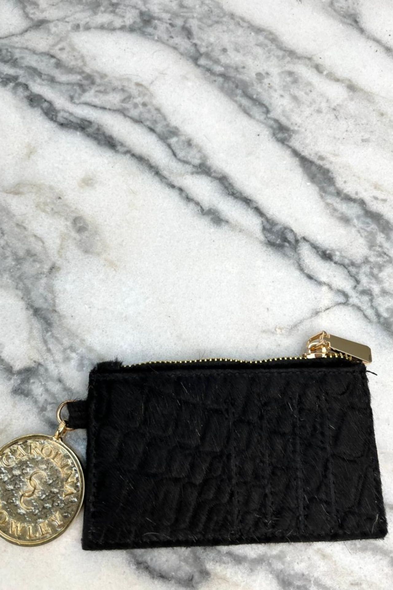 Tarjetero de pelo de vaca con textura grabada de cocodrilo, cuenta con 4 compartimentos para tarjetas y un bolsillo con cierre para usarlo como monedero . Es un accesorio muy práctico que podrás llevar en todos tus bolsos.