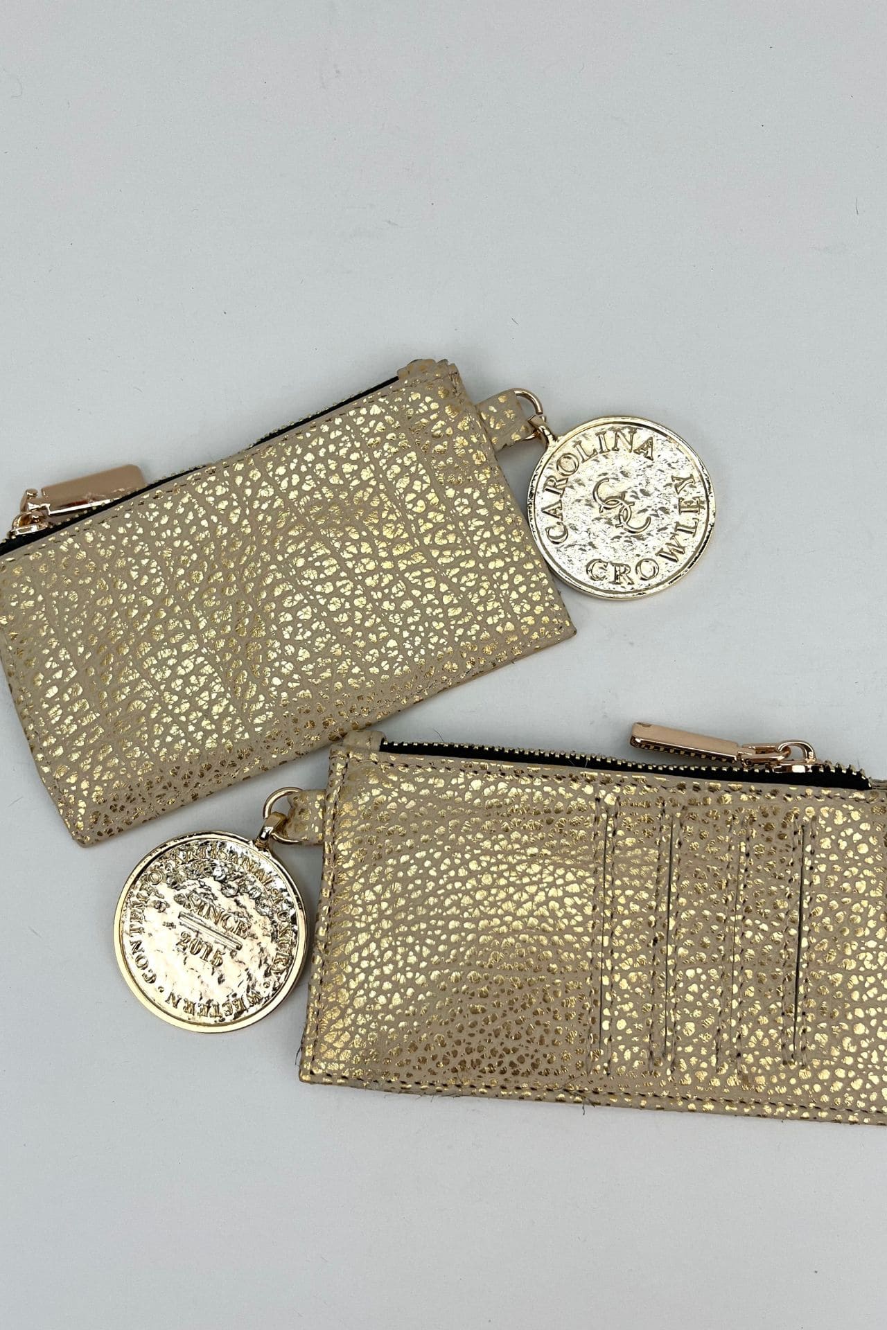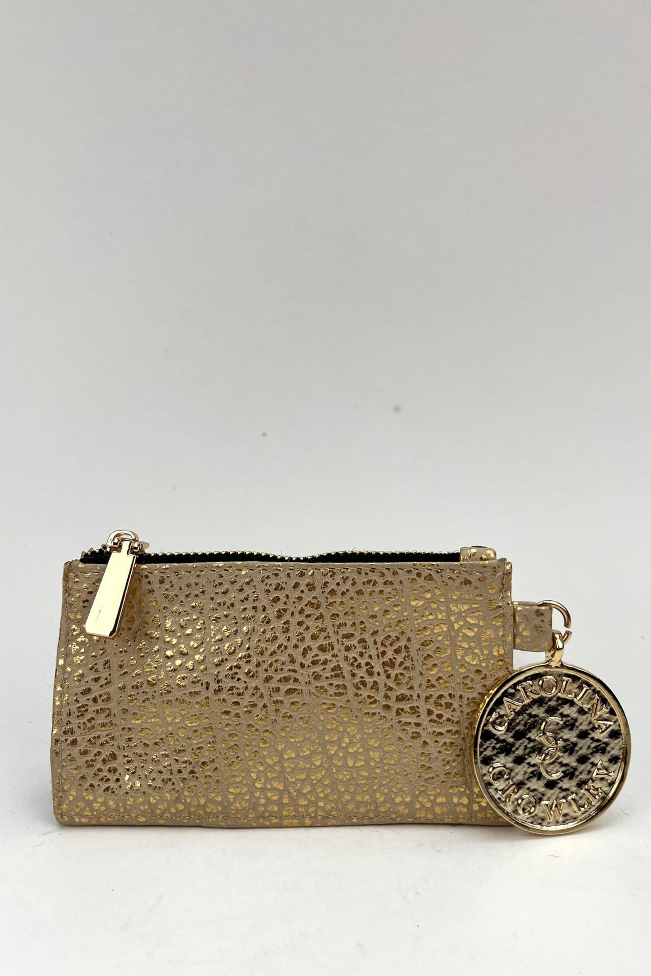 Tarjetero de piel con textura color oro con blanco, cuenta con 4 compartimentos para tarjetas y un bolsillo con cierre para usarlo como monedero . Es un accesorio muy práctico que podrás llevar en todos tus bolsos.