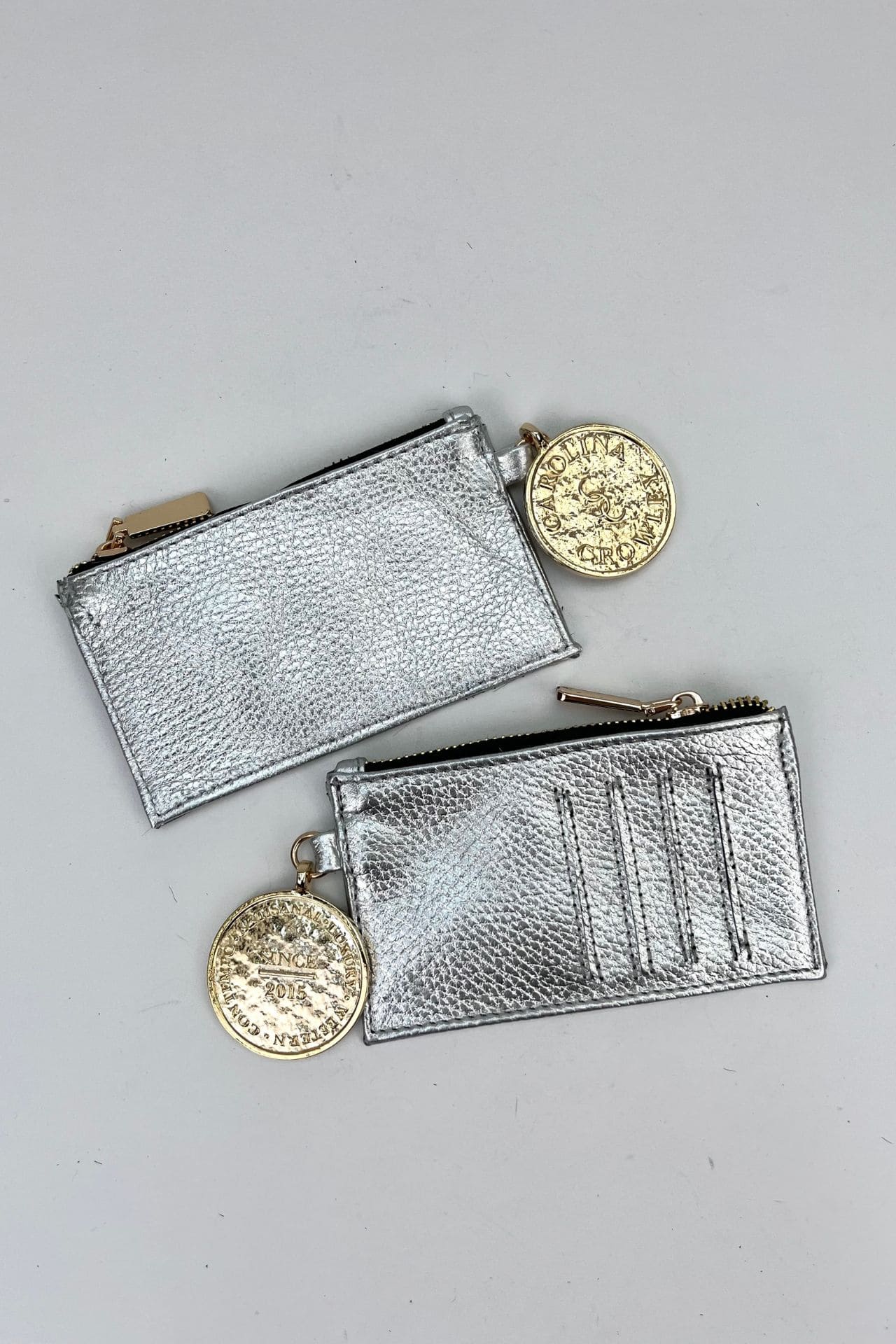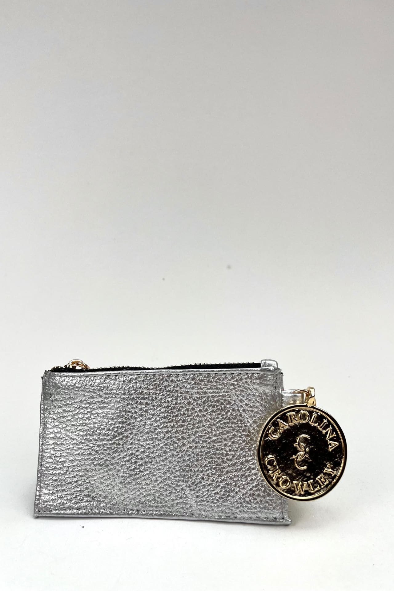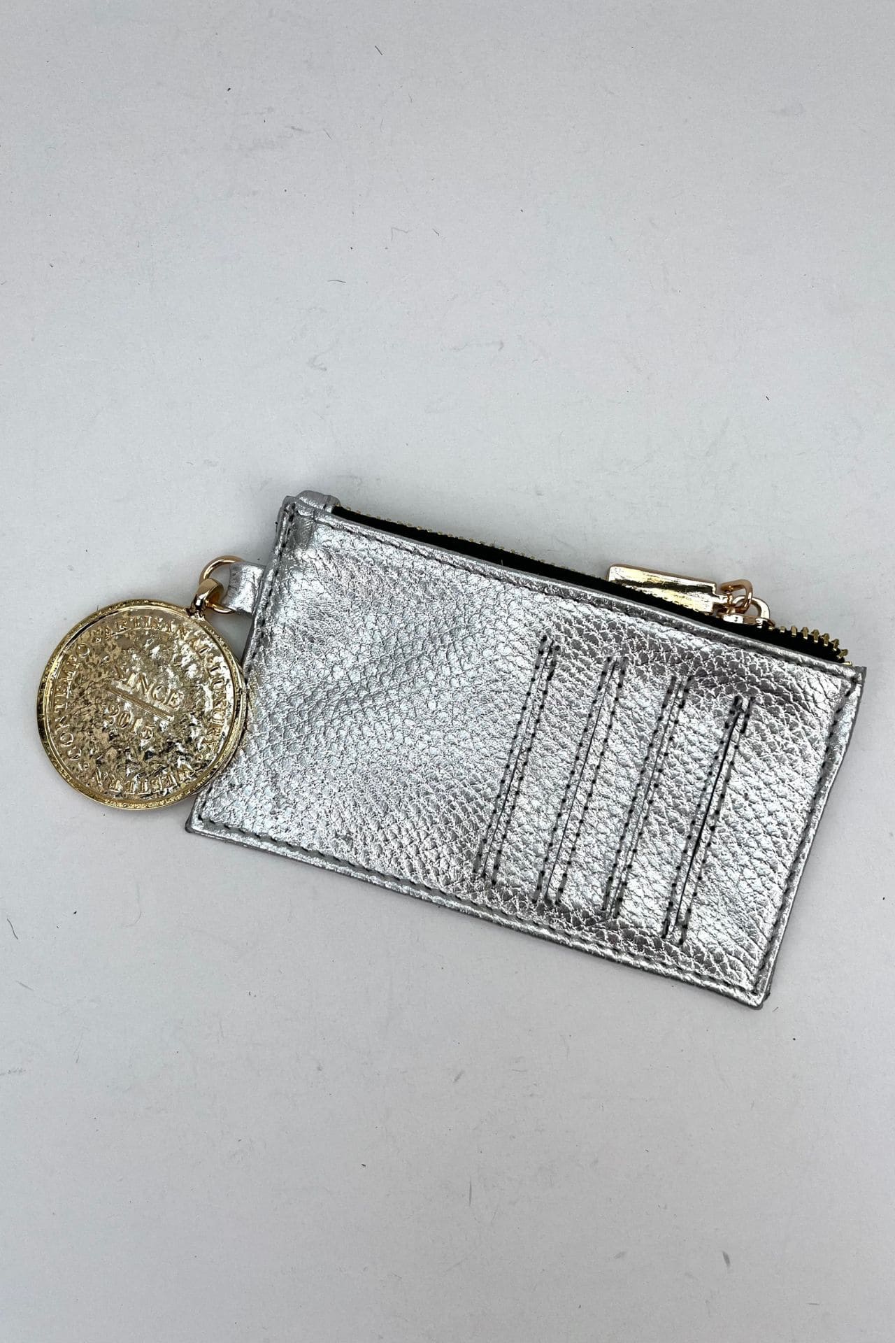 Tarjetero de piel con textura color plata, cuenta con 4 compartimentos para tarjetas y un bolsillo con cierre para usarlo como monedero . Es un accesorio muy práctico que podrás llevar en todos tus bolsos.
